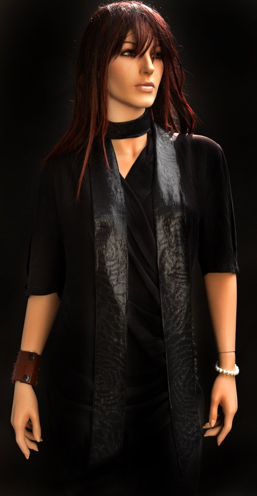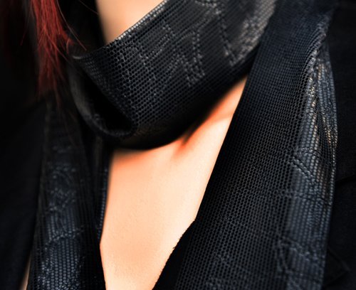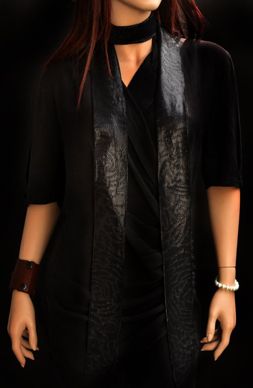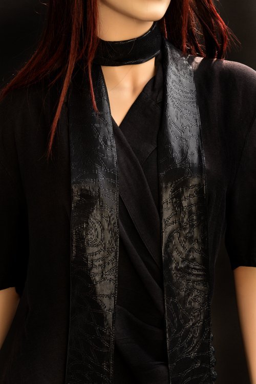 Heel lang smal sjaaltje, zwart glimmend, 7 x 225 cm, valt heel mooi. Heeft een soort print van een slang of zo in de stof in dezelfde kleur, zoals jacquard...